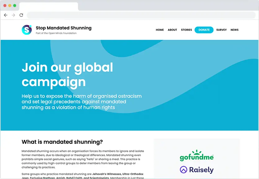 A global campaign to set legal precedents against mandated shunning within high-control groups as a violation of human rights and to expose the harm of organised ostracism.