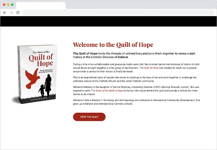Honouring survivors of clerical child sexual abuse in Ballarat. The Story of the Quilt of Hope: Threads of Unlived Lives tells the stories behind the Quilt of Hope.